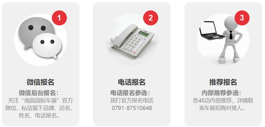 即日起至9月9日(截止時(shí)間9月9日下午17:00),各品牌汽車4S店的汽車銷售代表只需關(guān)注“南昌國(guó)際車展”官方微信,后臺(tái)發(fā)送報(bào)名信息或撥打電話0791—87510648進(jìn)行報(bào)名,還可以由各大汽車品牌單位內(nèi)部評(píng)選推薦報(bào)名 。