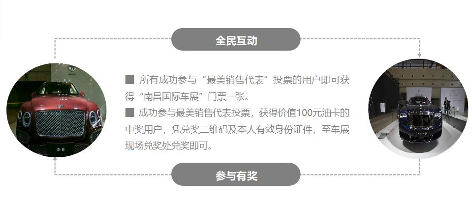 廣大市民的投票方式也非常簡(jiǎn)單,在9月10日—9月30日(截止時(shí)間9月30日12:00)這段時(shí)間內(nèi),通過(guò)登錄南昌國(guó)際車展官網(wǎng)或關(guān)注“南昌國(guó)際車展”官方微信,選擇“最美銷售”即可為心儀的銷售代表投票,每人每天有5次投票權(quán),最終以線上得票多少評(píng)出“最美銷售代表。并且,所有參與投票的朋友們?cè)谕镀焙蠓窒礞溄蛹纯蓞⑴c分享贏油卡活動(dòng),中獎(jiǎng)用戶即可獲得價(jià)值100元油卡一張!