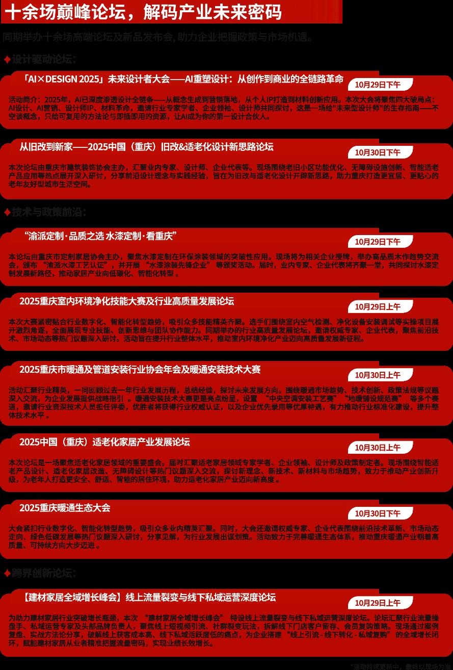 展會(huì)期間,組委會(huì)將聯(lián)合行業(yè)協(xié)會(huì)、權(quán)威媒體及頭部企業(yè),舉辦10余場(chǎng)專題論壇,緊扣產(chǎn)業(yè)趨勢(shì)、產(chǎn)品走向、舊改局改、以舊換新、適老家居、出海貿(mào)易、設(shè)計(jì)師活動(dòng)、整裝快裝、新媒體營(yíng)銷等核心議題,匯聚50+位行業(yè)領(lǐng)袖、學(xué)術(shù)專家與先鋒設(shè)計(jì)師,通過(guò)主題演講、圓桌對(duì)話、案例剖析等形式,深度解析政策紅利、技術(shù)趨勢(shì)與市場(chǎng)機(jī)遇,為行業(yè)提供從戰(zhàn)略到落地的全景式洞察。