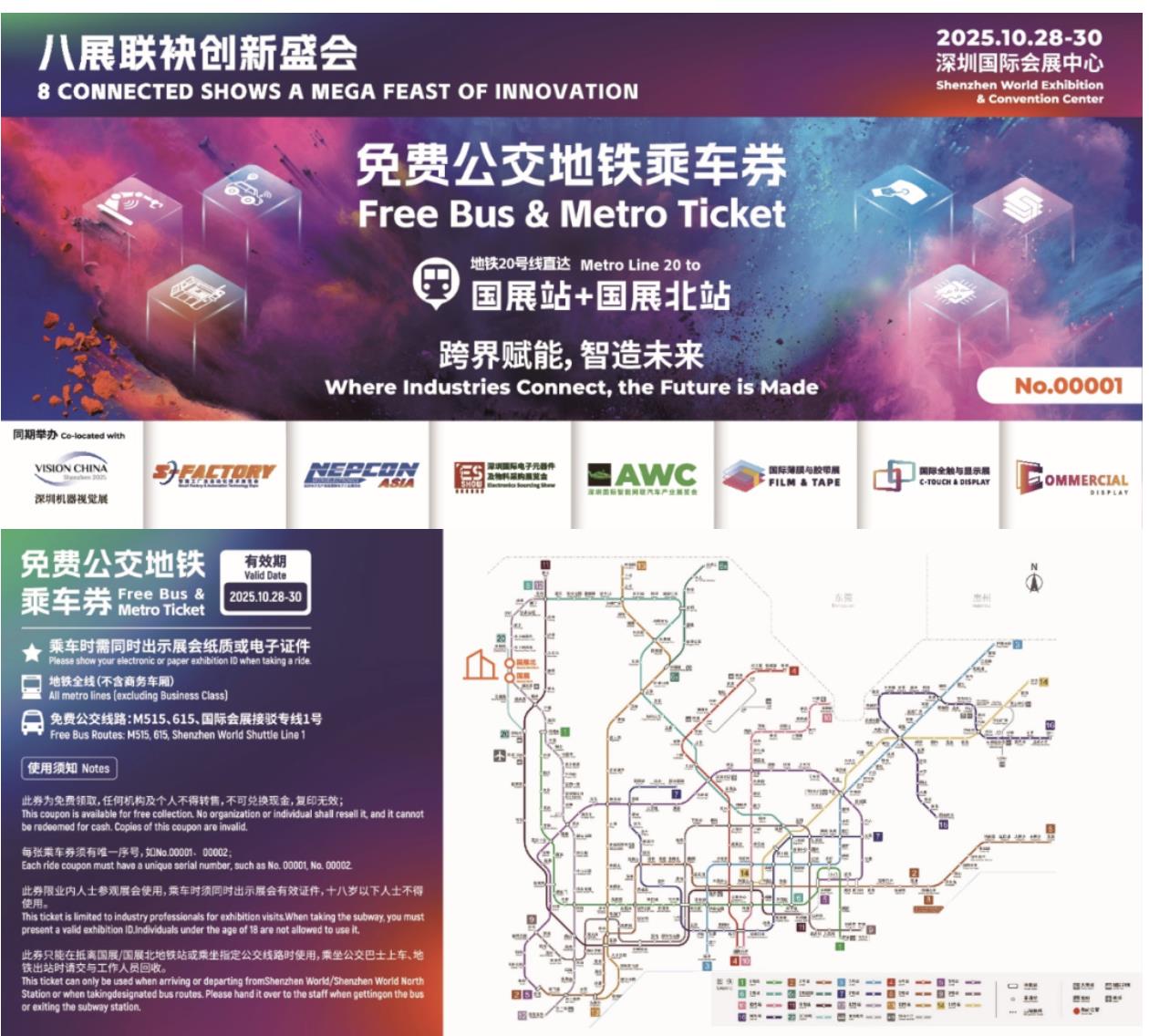 主辦方在開展期間特別為前來展會的參展商和觀眾提供免費公交地鐵乘車券,憑您的“2025亞洲工業(yè)科技展 ”任一展會的展商證或參觀證領(lǐng)取,每人每天限領(lǐng)2張,當(dāng)日領(lǐng)完為止。