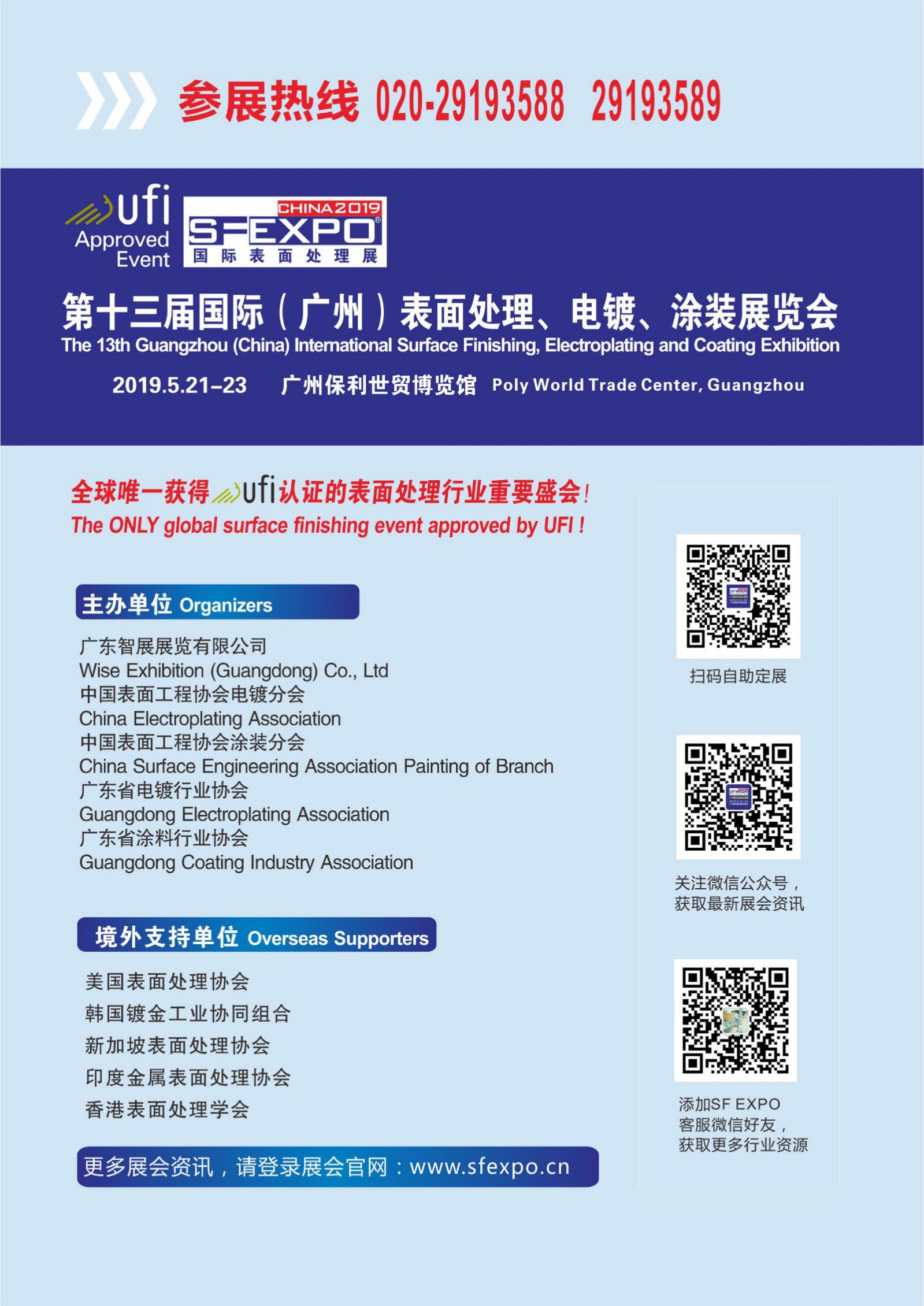 下屆展會將定于廣州,于2019年5月21-23日在廣州保利世貿(mào)博覽館隆重舉行!SF EXPO2019將加入智能制造、環(huán)保及安全等板塊,并在同期舉辦工業(yè)涂料展覽會及多個高峰論壇及技術研討會等。目前,2018國際(廣州)表面處理電鍍涂裝展覽會已進入火熱的籌備階段!